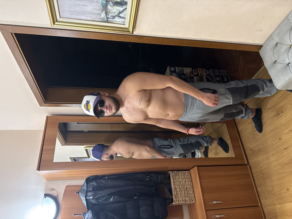 An adult male stands in what appears to be a residential entryway in Pleven, Bulgaria. He is shirtless, displaying a tattoo with Roman numerals on his left pectoral. He wears a white and purple Los Angeles Lakers baseball cap, dark sunglasses, grey and dark grey paneled sweatpants, and dark ankle socks. A red bracelet is visible on his left wrist. His reflection, showing his left profile, is visible in a full-length mirror on the left side of the frame. The immediate environment includes a wooden floor, light-colored walls, and a wooden storage unit with a mirror and coat rack. Dark jackets hang from the coat rack, and a light-brown woven basket sits on a shelf below. To the right, an open wooden door frame leads to a dark interior. A gold-framed picture depicting figures with umbrellas in the rain hangs on the wall to the right of the door frame. The corner of a grey upholstered, button-tufted footstool is partially visible in the lower right foreground. An overhead light fixture is visible in the upper left.