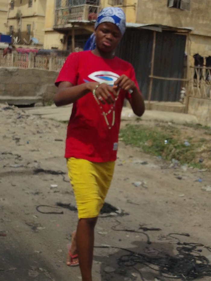 An individual is depicted standing outdoors on an unpaved, debris-strewn ground in Sabon Gari East, Nigeria