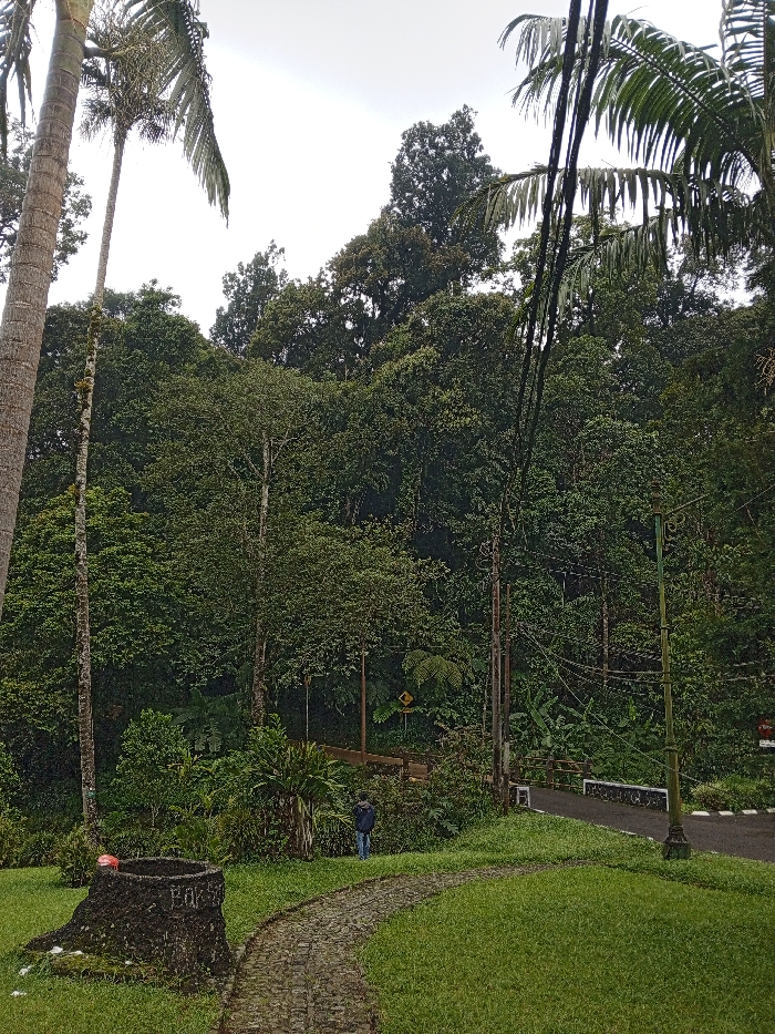 A stone-paved path winds through a grassy lawn toward a dense forest under a cloudy sky. A dark-clothed person stands near the path's edge, facing the woods. A weathered tree stump sits on the lawn, inscribed with faint text. Tall palm trees frame the scene, and a vintage lamppost stands near a road in the background, partially hidden by greenery. The forest looms, a mix of tall trees and lush undergrowth.