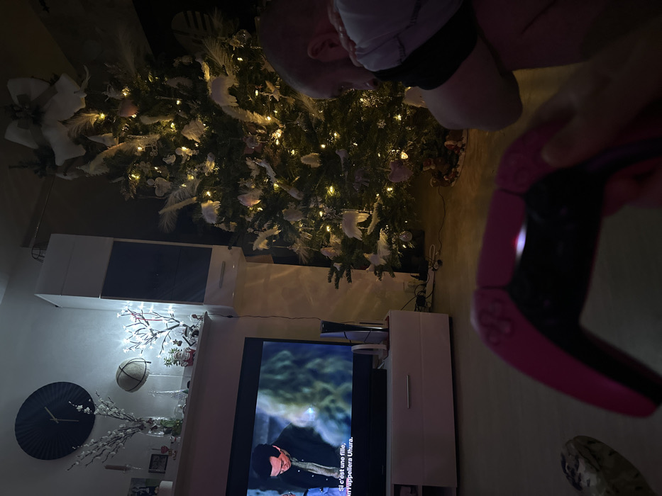 A cozy living room scene features a decorated Christmas tree and entertainment center with a television displaying a film with subtitles. The TV is located at the center of the white media console. A person holds a pink PlayStation 5 controller. A clock, decorative items, and lights adorn the shelves. The room appears dimly lit, creating a relaxed and festive atmosphere.