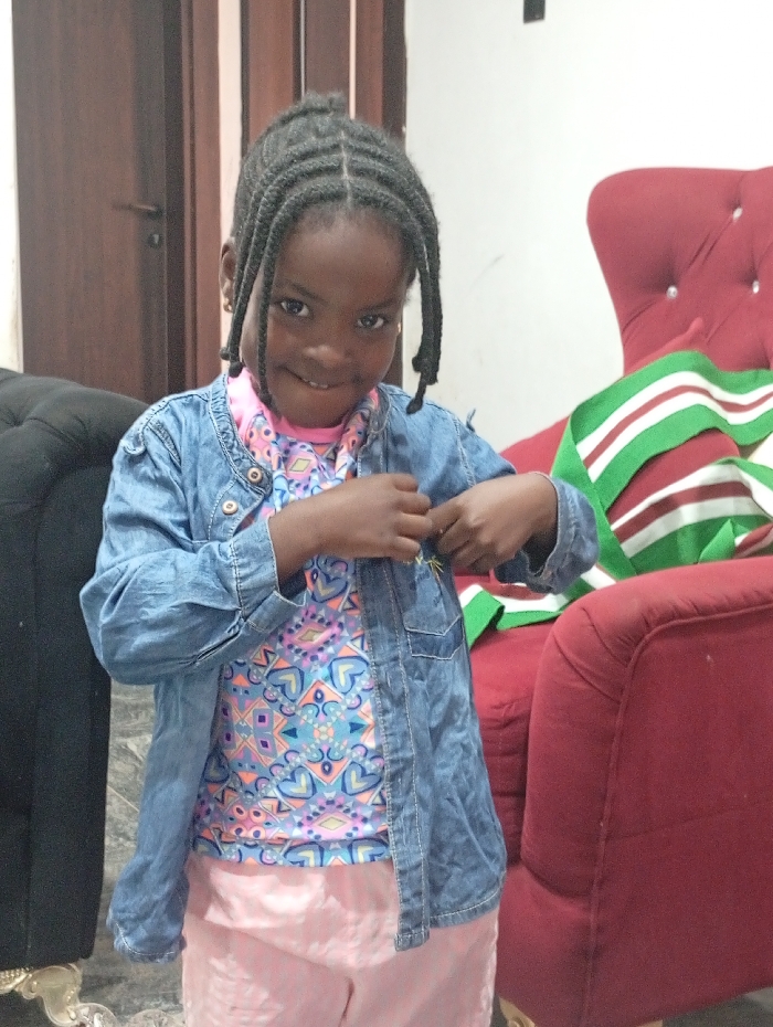 A young Black female child stands centered in an indoor setting within the city of Unknown, Unknown