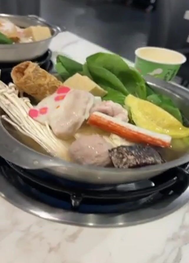 two pots of Asian-style hot pot sitting on a white marble table. The pots are made of stainless steel and sit on black induction burners. The hot pots contain a variety of ingredients, including greens, mushrooms, tofu, fish balls, and imitation crab meat. The video provides a close-up of the hot pot, showcasing the different ingredients and their arrangement in the broth. The environment appears to be a restaurant setting with clean lines and modern decor. The video is stable and in focus, providing a clear view of the hot pot and its surroundings.