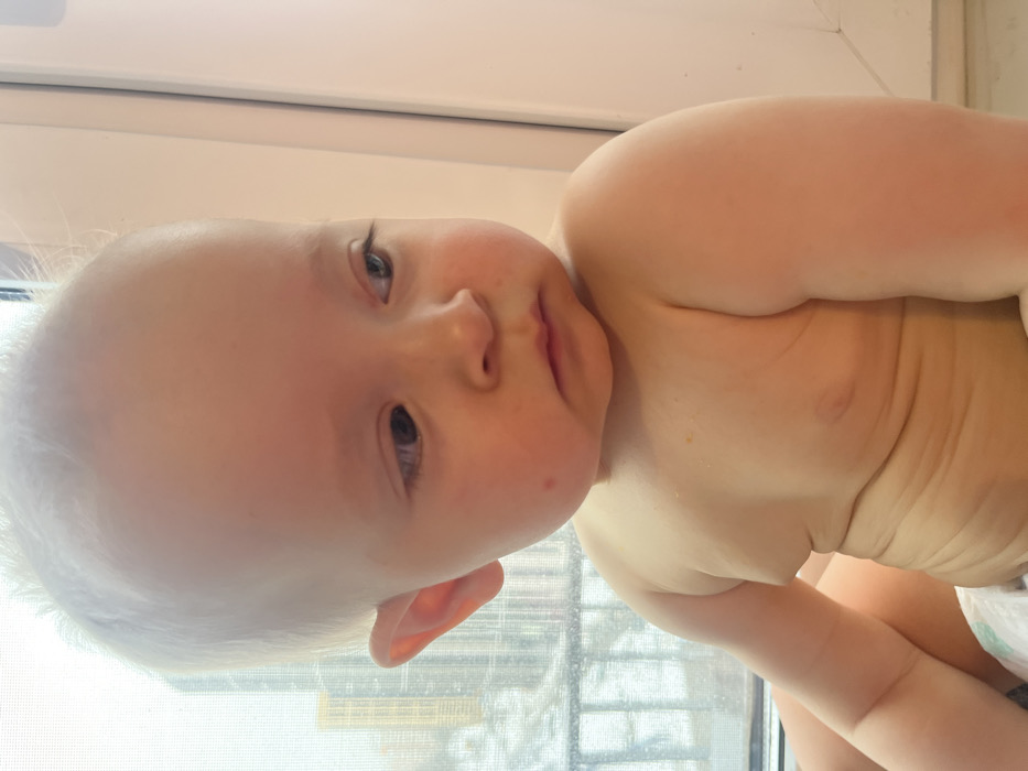 - "A fair-skinned infant, with sparse light-blonde hair, is depicted bare-chested and wearing a diaper, seated in front of a window" by FM-v5Wx12, licensed under CC BY 4.0