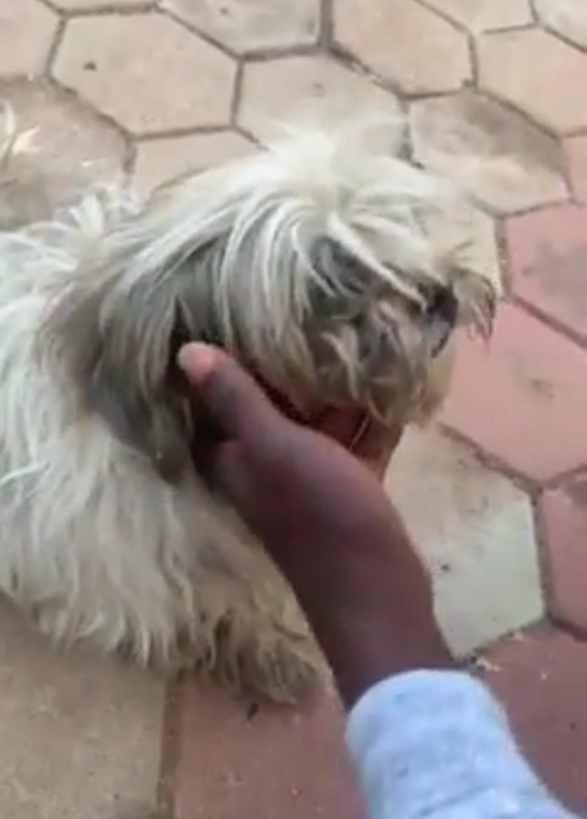A person is petting a small, long-haired dog on a paved surface made of hexagonal tiles. The dog is light-colored, possibly white or tan, with some darker patches and long, messy fur covering its face. The person petting the dog has dark skin and is wearing a white long-sleeved shirt. The person's hand is petting the dog's neck and chin. The paved surface is composed of interlocking hexagonal tiles in a mix of light brown and reddish hues. The overall lighting appears to be natural daylight.