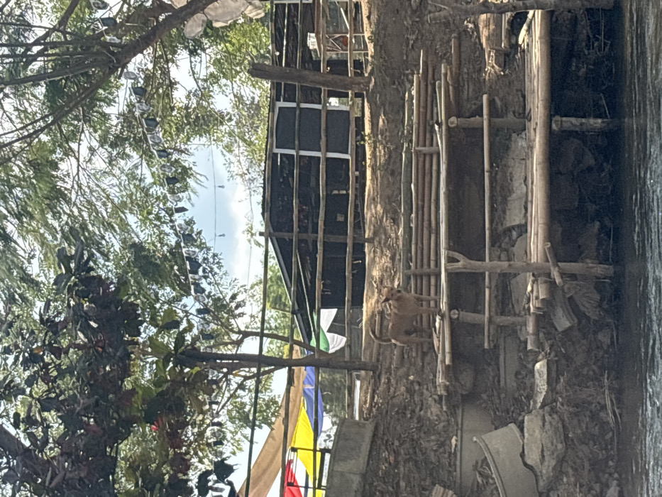 A vertically oriented shot depicts a tree beside a bamboo structure with colorful flags. Decorative items hang from overhead branches, creating a festive atmosphere. A small brown bird perches on the bamboo, blending with the natural surroundings. The background is somewhat hazy.