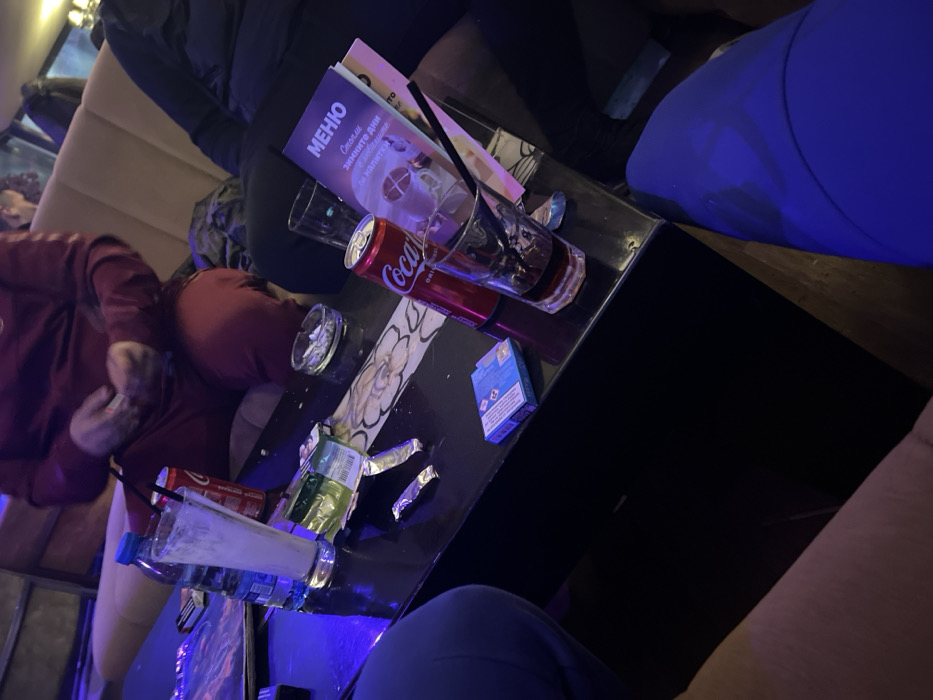 The image depicts an indoor scene at a lounge or cafe in Svishtov, Bulgaria, under dim blue ambient lighting