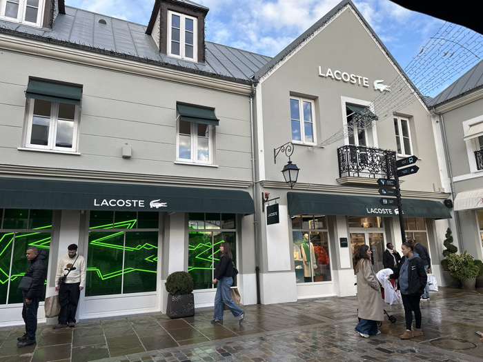The image depicts an outdoor retail street scene at La Vallée Village, an outlet shopping center located in Serris, France. The environment shows overcast skies with patches of blue and a wet, flagstone-paved ground, suggesting recent precipitation. The scene features two adjacent Lacoste stores, both exhibiting a similar architectural style with light grey facades and dark grey pitched roofs. The building on the left is a two-story structure with two dormer windows on its roof. Its ground floor storefront has a dark green awning displaying "LACOSTE" and the crocodile logo in white. Behind the large display windows, bright green, neon-like geometric patterns are visible. Two upper-story windows also feature dark green awnings. To the left of this storefront, a man in a black puffer jacket and dark pants stands, holding a black shoulder bag. Next to him, a man in a light-colored crewneck sweater, dark pants, and a dark shoulder bag stands holding a light-colored shopping bag. Between these two individuals and the adjacent building, a square black planter contains a green spherical shrub. A woman in a dark top, blue jeans, and light sneakers walks towards the left, carrying a light-colored shopping bag. The building on the right features a prominent gable front with raised white "LACOSTE" lettering and the crocodile logo positioned centrally on the upper facade. Below, a dark green awning covers the main entrance and display windows, which showcase clothing items including a green jacket on a mannequin. A black ornamental street lamp is affixed to the facade to the left of the entrance. Above the main entrance, a small, black wrought-iron balcony is present beneath an open window. Overhead, white decorative string lights are strung across the street and draped around the balcony area. In front of this Lacoste store, a black directional signpost with white arrows points to various services (e.g., bus, information, restrooms). Two women are interacting near the store entrance. One woman, on the left, wears a long beige coat and dark wide-leg pants. She faces right, engaged in conversation with the second woman. The second woman, on the right, wears a black puffer jacket, black leggings, and light brown boots. She stands facing left, next to a white and red baby stroller, which appears to contain a child or infant. A third, partially visible individual in a dark jacket is discernible behind these two women. To the far right, a tall, conical topiary plant is situated in a dark planter.