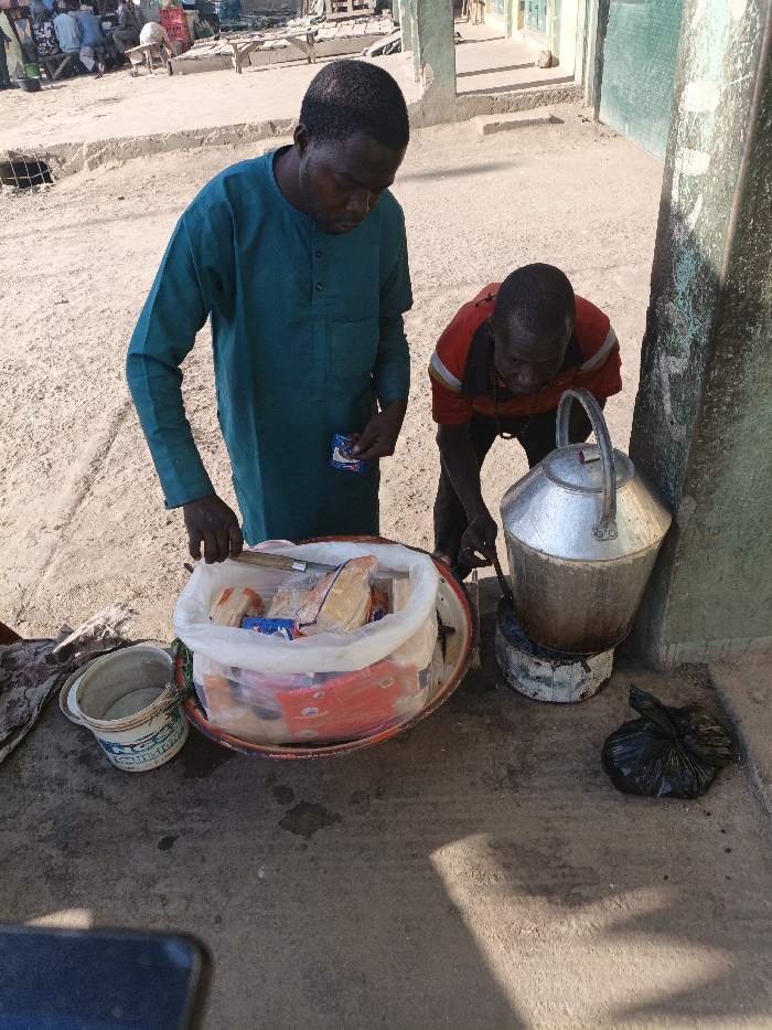 Two men stand near street vendor items. One man, wearing a green tunic, holds a small packet near a tray overflowing with wrapped foods. Next to him, a second man in a red shirt attends to a large silver kettle that sits atop a small stove. Nearby, a white bucket and a discarded black plastic bag are also visible. The scene unfolds on a sunlit street near a building with green walls and multiple openings, suggesting a communal area.