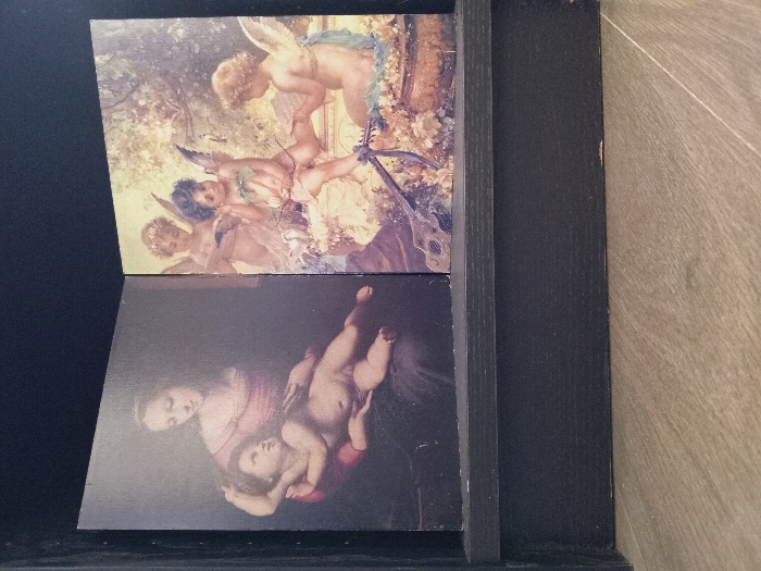 Two artwork panels sit stacked in a black-framed display. The top panel features cherubs in a warm-toned, outdoor scene. The bottom panel portrays a woman holding a baby, painted in a darker, muted palette. The display case is black. To the right, a light brown, textured surface is visible.