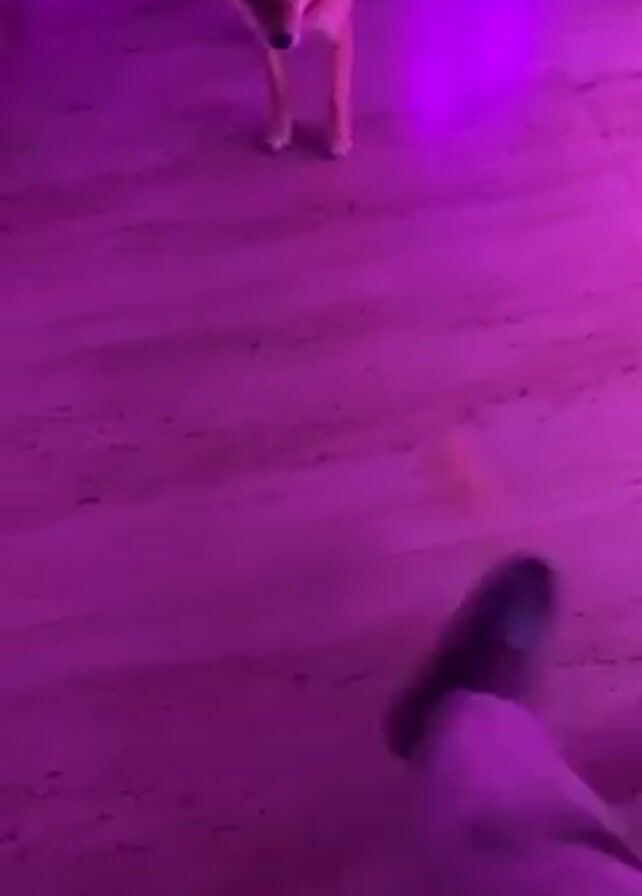 A reddish-brown Shiba Inu dog walks on a wood-look tile floor under a magenta light