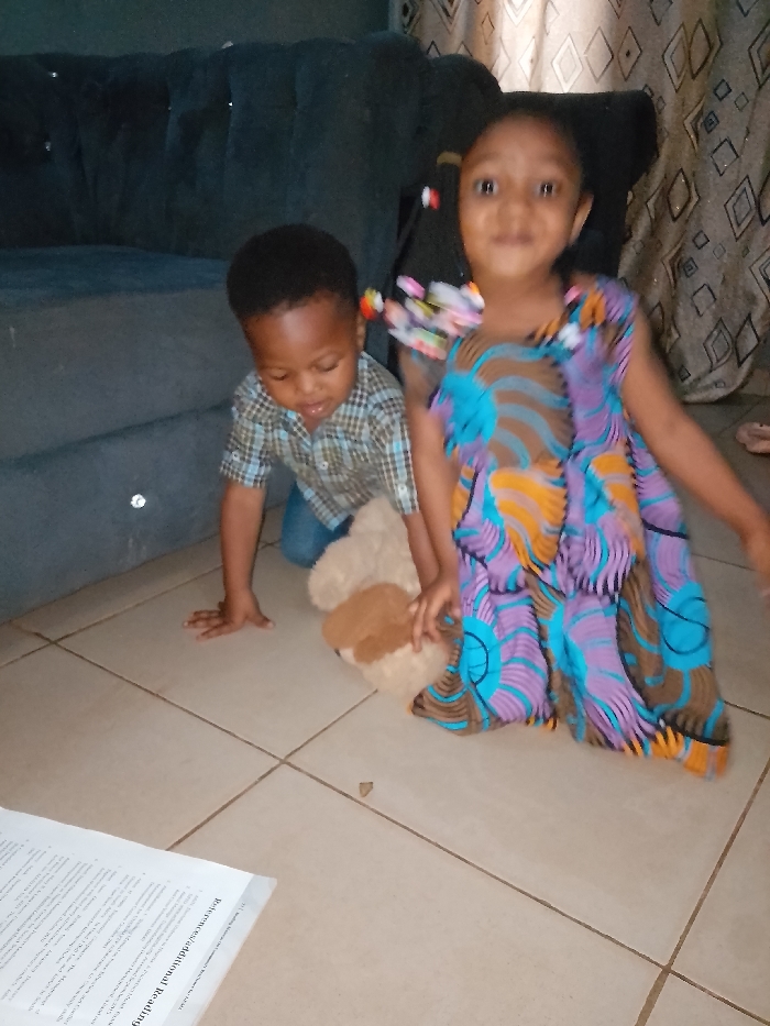 - "The image depicts two young children and a stuffed animal on a tiled floor within a domestic interior in Yelwa, Nigeria" by FM-yIzVQ2, licensed under CC BY 4.0