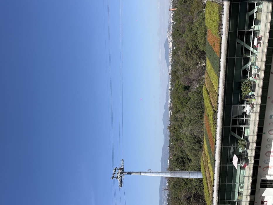 The image depicts an elevated view over a building with a green roof, a dense urban forest, and a distant cityscape under a clear blue sky, in Mexico City, Mexico