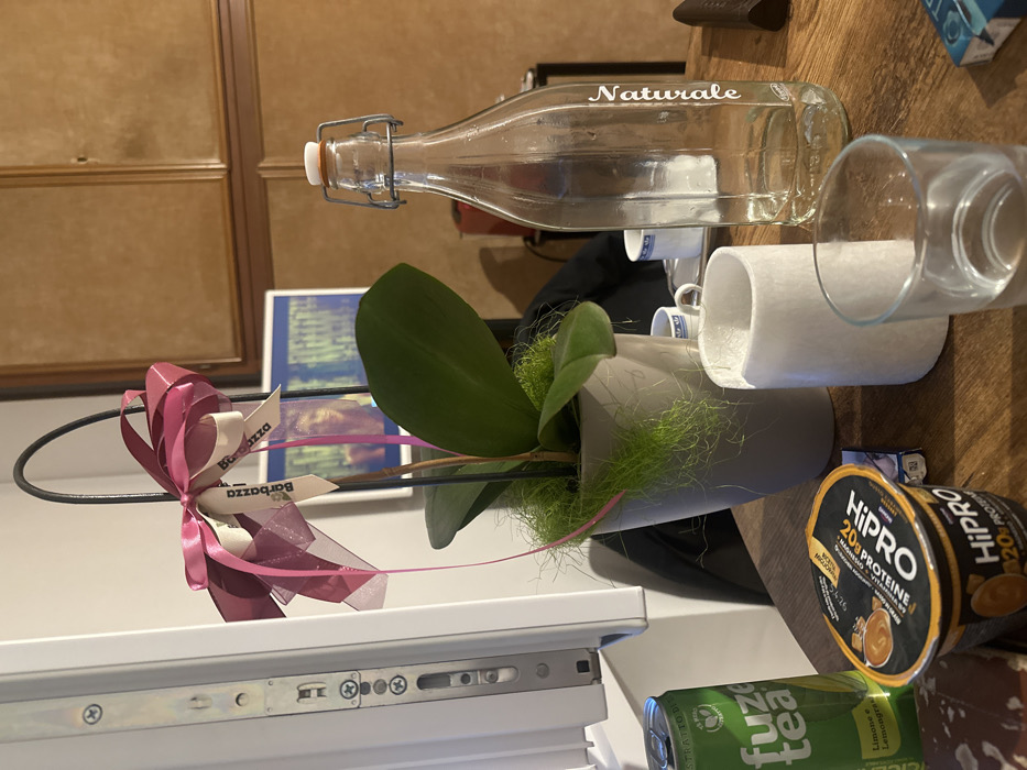 An indoor scene is depicted on a wooden surface in Treviso, Italy. In the foreground, a green can of Fuze Tea, labeled "Limone e Lemongrass," sits to the left of a dark orange HiPRO 20g Proteine yogurt container, which appears to be caramel flavored. To their right, a white cylindrical object, possibly a candle or candle holder, stands next to a short, clear glass containing a small amount of clear liquid. The midground features a potted orchid plant in a grey pot, decorated with green synthetic fibers around its base and a multi-layered pink ribbon bow at the top of its support stake. Attached to the bow are cream-colored ribbons, one prominently displaying the text "BarbazZa." To the right of the orchid, a tall, clear glass swing-top bottle, labeled "Naturale" in white script, stands upright. In the background, a light-colored vertical panel with visible screw heads is on the left. On the right, wooden cabinet doors or wall paneling are visible. A framed image with indistinct blue and pink elements is partially visible behind the orchid. No individuals are present, and no actions or interactions are occurring.
