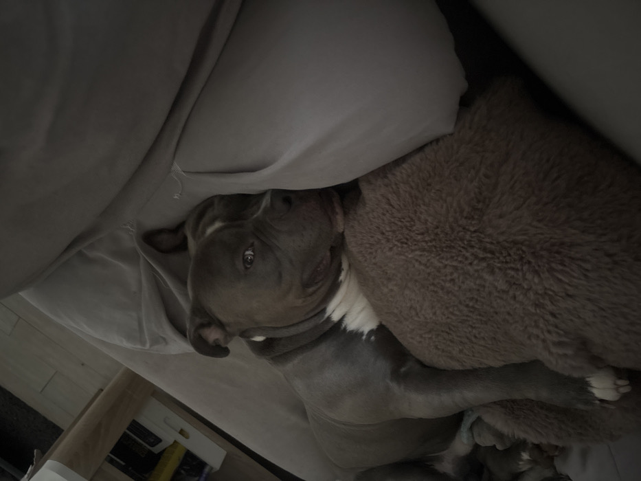 - "The image displays a blue-grey canine, consistent with an American Staffordshire Terrier or Pitbull breed, at rest within an indoor setting in Jarny, France" by FM-rEJ0w2, licensed under CC BY 4.0