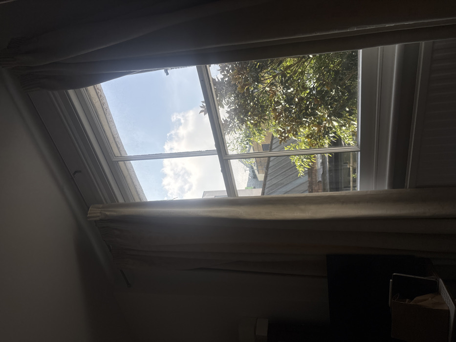 An interior photograph taken in London, United Kingdom, captures a view looking outward through a window on a clear day with scattered clouds