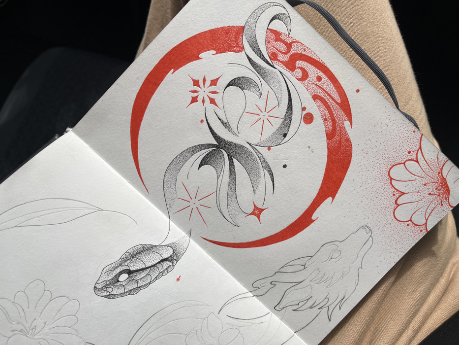 An open white sketchbook, illuminated by a direct light source, rests on a light brown fabric surface in Aksay, Russia. The left page displays multiple unfinished pencil sketches, including the stippled head of a snake with a black eye in the upper left, an outlined wolf or fox head below it, and faint floral and leaf patterns. The right page features a partially completed tattoo design. This design is dominated by a red crescent shape rendered with varying densities of red stippling, which frames a central black stippled, flowing, ribbon-like motif. Within this motif are three starburst elements, two 8-pointed and one 6-pointed, outlined in black and filled with red. A section of the red crescent incorporates a wave-like pattern of lighter red stippling. Towards the bottom right of the page, a partial red floral element with stippling is visible. A black elastic band is secured around the bottom right edge of the sketchbook.