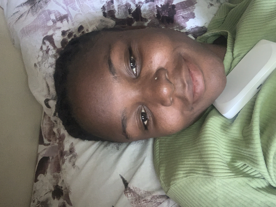 A single adult female is depicted in a close-up, head-and-shoulders portrait within an indoor setting, likely a bedroom. The subject has dark skin, dark hair appearing braided or pulled back, and a small stud piercing on her right nostril. She is smiling faintly and looking directly at the camera. She wears a light green, ribbed, long-sleeved top. A white, rectangular electronic device rests on her chest, partially obscured by her garment. The background consists of a white pillow with a faded brown and grey floral pattern. No visual information within the image allows for the identification of the specific city of Tempure, Nigeria, or any other precise geographical location.