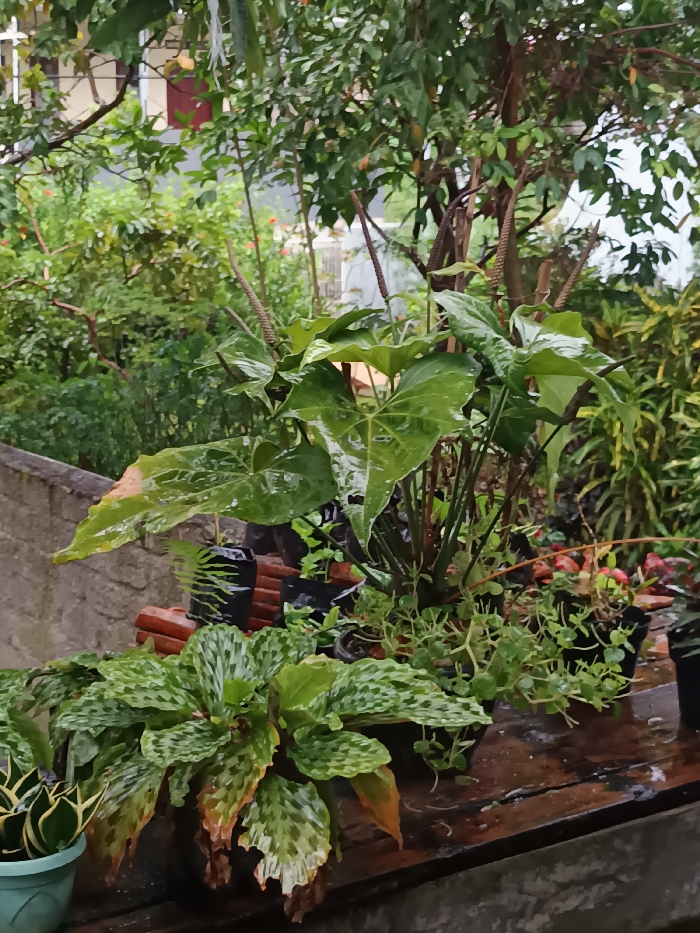 This image depicts a visibly wet outdoor garden scene in Limbangan Sari, Indonesia. In the foreground, a light green pot contains a variegated Sansevieria plant. To the right, a dark pot holds a plant with large, textured green leaves exhibiting patterned light and dark areas, with some browning on the edges; this plant rests on a dark, wet wooden surface. Centrally, a larger plant with glossy, dark green, heart-shaped leaves and multiple prominent dark spadix structures is visible. Smaller trailing green plants in black pots are positioned to its right. Behind the foreground plants, black plastic nursery bags and reddish-brown objects resembling bricks are discernible. A gray concrete wall runs along the left side. The background consists of dense green foliage and trees, partially obscuring a light-colored building with a visible red door, indicating a lush, moist environment.