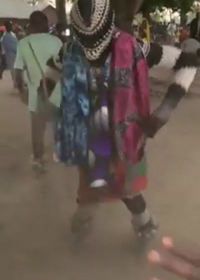 person dressed in a colorful costume and mask dancing in a dusty outdoor area with other people around. The dancer wears a black and white knit mask, a colorful patchwork shirt, and what appear to be ankle bells. The ground is dusty, and there are trees and buildings visible in the background, indicating a village setting. People are seen moving around the dancer, some watching, some dancing, and some clapping. A hand wearing a silver bracelet is visible briefly in the foreground. The scene appears to be part of a cultural celebration or performance.