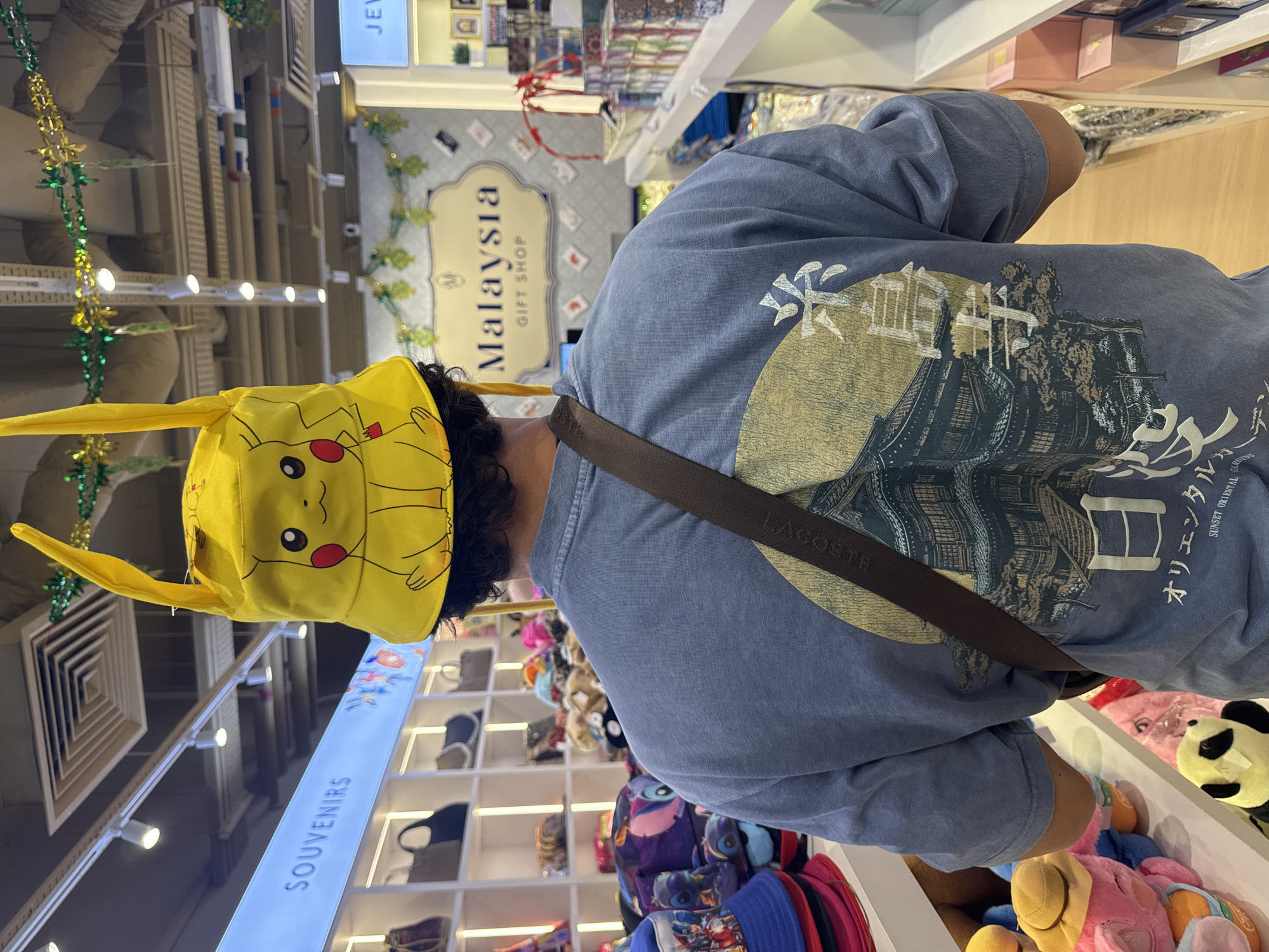 A person is depicted from the rear, standing in a brightly lit gift shop, likely located within Kuala Lumpur International Airport (KLIA) in Sepang, Malaysia. The individual wears a yellow bucket hat featuring a Pikachu face and ears, and a faded blue short-sleeved t-shirt. The t-shirt's back displays a graphic with a golden sun, a multi-tiered traditional building, trees, and Japanese characters, with "ORIENTAL SUNSET ORIENTAL GARDENS" printed below. A dark brown shoulder bag strap, bearing the visible brand name "LACOSTE," crosses their back. The shop environment features white shelving units. To the left, a section labeled "SOUVENIRS" displays various handbags, a stack of colorful bucket hats (including Stitch-themed designs), and plush toys. To the right, another shelving unit holds packaged items, and a partially visible sign reads "JEW" (likely "JEWELRY"). In the background, a prominent sign with a decorative beige frame reads "Malaysia GIFT SHOP." The ceiling shows exposed pipes, square ventilation grilles, and track lighting fixtures. Green and gold tinsel garlands, along with small green leaf-shaped ornaments, are strung across the upper sections of the shop. The floor is light-colored wood or laminate.