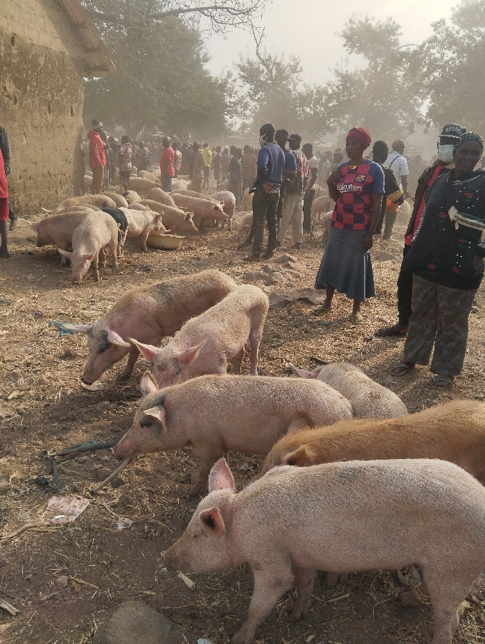 This image depicts an active outdoor pig market located in Unguwan Rimi, Nigeria