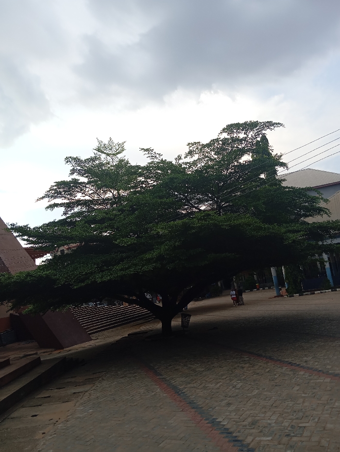 The image depicts an outdoor area in Onitsha, Nigeria, under an overcast sky with predominantly grey cloud cover. A large tree with a dense, dark green canopy and a visible trunk occupies the central frame, casting a broad shadow across the paved ground. The ground is surfaced with interlocking concrete blocks arranged in a brick pattern, intersected by a diagonal red and black striped design in the lower half of the frame. To the left, a reddish-brown, multi-tiered concrete or brick structure with prominent steps and angular features rises. A wide, ascending staircase is integrated into this structure, partially obscured by the tree. In the midground, to the right of the tree, three individuals are observed standing on the paved surface; one wears a light-colored top. A cylindrical light-colored trash receptacle is located near the tree's base. The background features a building with a light-colored pitched roof on the right, above which multiple black utility lines are strung horizontally against the sky. The scene is illuminated by diffused light, consistent with the cloudy atmospheric conditions.