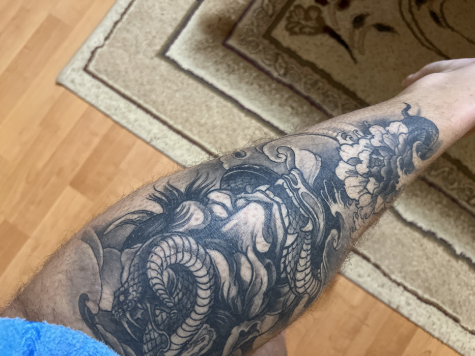 The image displays a close-up of an adult human lower leg, partially covered by blue fabric at the top left. The leg features an extensive black and grey tattoo, depicting a Japanese Hannya mask with sharp teeth and horns, a coiled snake or dragon, and a large peony flower amidst wave-like patterns. The background consists of a light-colored wooden laminate floor on the left and a beige-toned patterned area rug with geometric and floral motifs on the right. The precise location within the city of Dolna Mitropolia, Bulgaria, cannot be determined from the visual evidence.