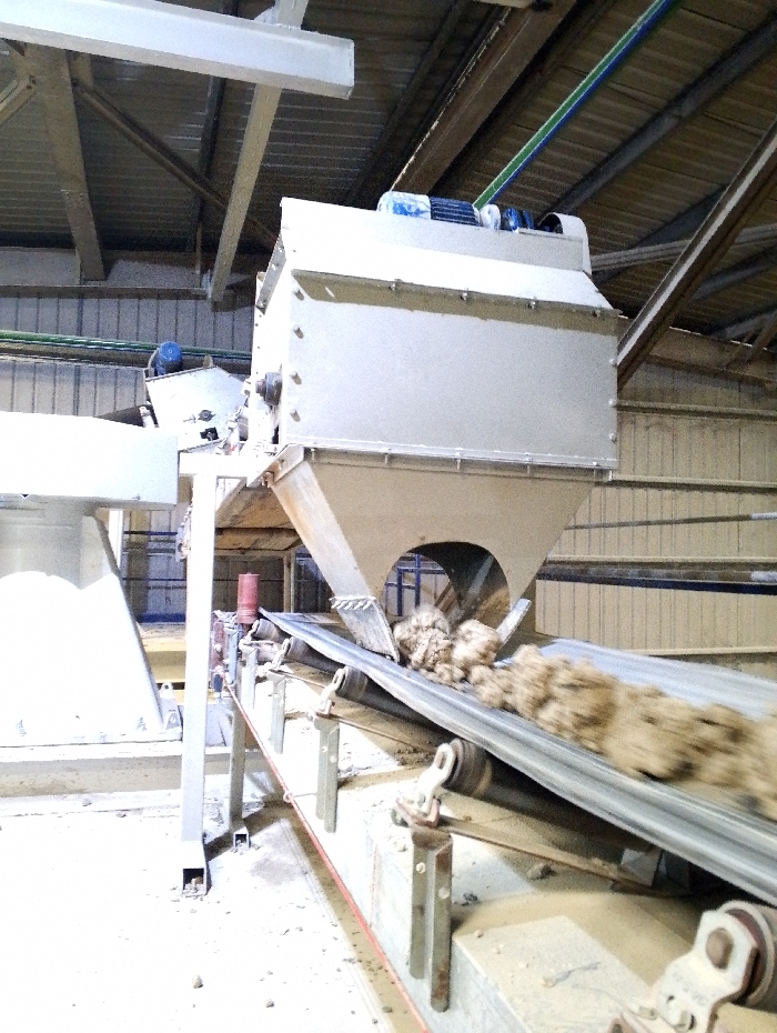conveyor belt system in a large industrial facility, likely a factory or processing plant. Located in Pangasia, Bangladesh (latitude: 22.693, longitude: 90.601), the system comprises a metal hopper with a motor attached, connected to a metal conveyor belt. The belt is transporting a mass of loose, light-brown material, possibly sand or gravel, which is being discharged from the hopper. The environment is characterized by the presence of metal beams, a concrete floor, and a partially visible corrugated metal wall. There are no people present in the image. The system appears to be in operation, as the material is being transported along the belt. The scene is devoid of any human activity.