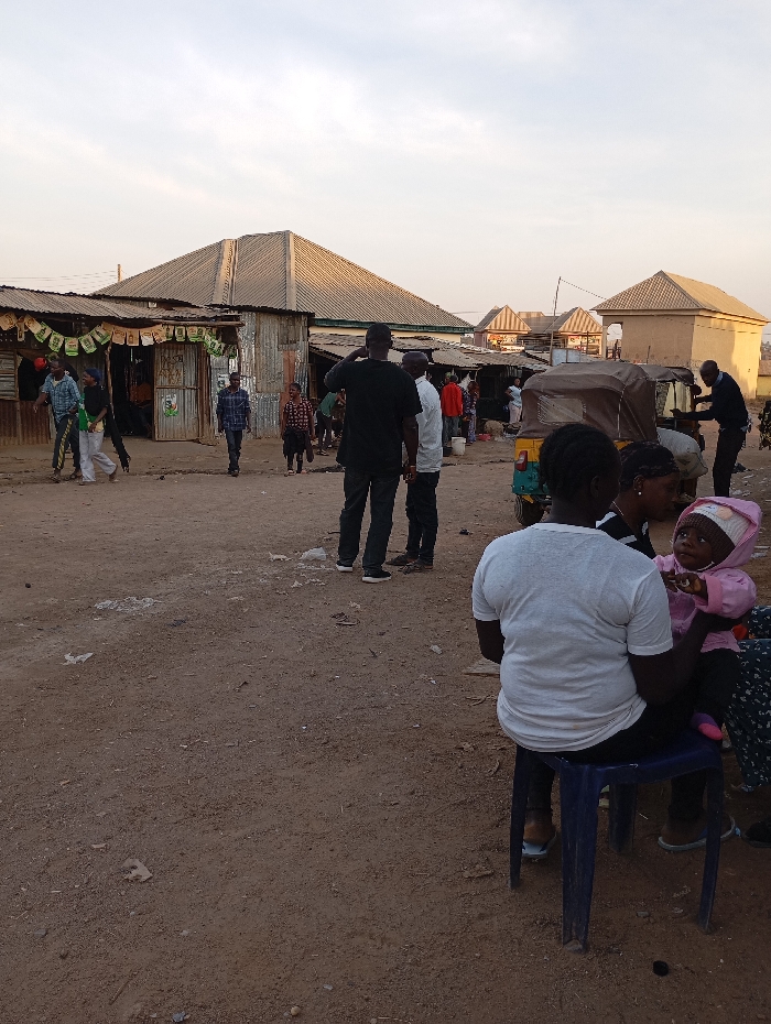 This image depicts an outdoor scene in Gura Top, Nigeria, characterized by a busy, unpaved dirt ground and numerous individuals