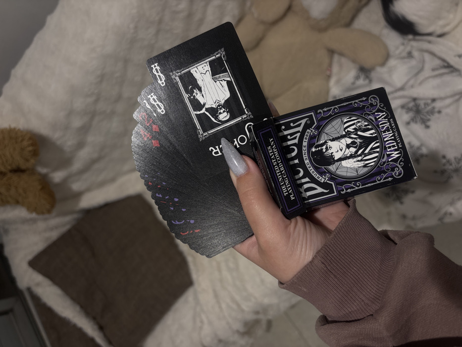 The image depicts a close-up, downward-angled view of a person's right hand holding a deck of playing cards and its tuck box, located indoors in Kiryat Motzkin, Israel. The hand, exhibiting long, almond-shaped fingernails with silver glitter polish, wears a brownish-pink long-sleeved garment. The primary objects are a "Wednesday" themed Bicycle playing card deck. The tuck box, predominantly black and purple, features an illustration of Wednesday Addams and text including "BICYCLE" and "WEDNESDAY PLAYING CARDS." Several cards are fanned out, revealing black backs with subtle texture. One visible card face is a Joker, rendered in black and white, showing a framed figure in a striped outfit. The background is softly out of focus, showing a light-colored, fluffy textured blanket or throw covering a surface, alongside a brown throw pillow. A large, light brown plush toy is partially visible on the right, resting on a patterned blanket.