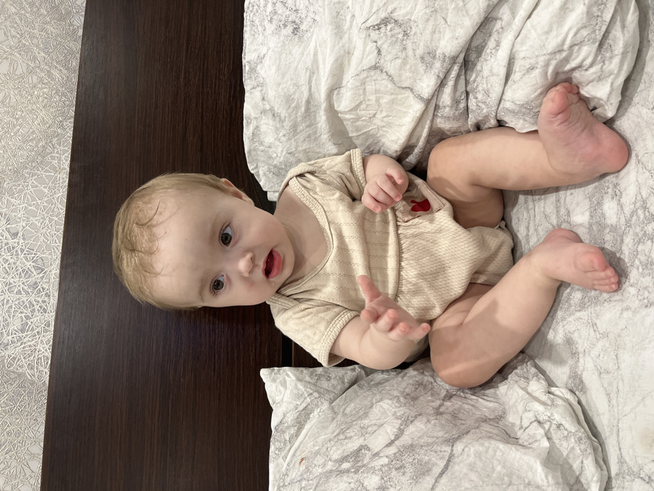 An infant, estimated between six and eighteen months of age, with light brown hair and brown eyes, is seated upright in an indoor setting. The individual wears a light beige, textured short-sleeved romper, which features a small red embroidered design on the right hip area. The infant's mouth is slightly open, and its gaze is directed towards the left side of the frame. The left hand is partially raised with fingers splayed. The individual is positioned on light-colored bedding, consisting of patterned pillows and a duvet with a grey, marble-like pattern. Behind the infant is a dark brown headboard. Above the headboard, a light-colored wall with a textured, abstract pattern resembling tangled white lines on a grey background is visible. The specific location within the city of Chaikovsky, Russia, cannot be determined from the visual information provided.