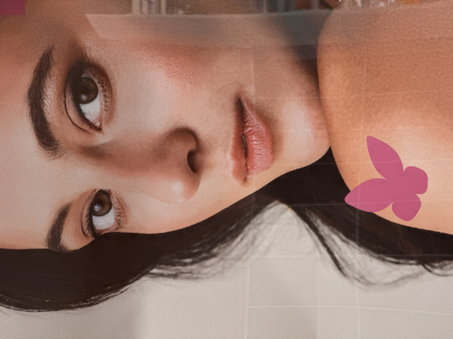The image displays a photograph of a large-scale portrait, likely an advertisement, located in the city of Chaikovsky, Russia. The central subject is a woman, captured from the mid-chest upwards, with her head slightly tilted to her right. She possesses dark, long hair, dark brown eyes, and prominent dark eyebrows, maintaining a direct gaze towards the viewer. Her skin appears fair, with visible blush on her cheeks and defined lips that are slightly parted. Her bare right shoulder is visible in the lower right portion of the frame. A two-dimensional, magenta-colored, stylized butterfly graphic is overlaid on her right shoulder. The background immediately behind the woman on the left consists of light-colored square tiles, suggesting an indoor, possibly bathroom or kitchen, environment. The background on the right side of the woman presents transparent or reflective effects, revealing blurred architectural details and fragmented reflections consistent with an urban or indoor setting within Chaikovsky, Russia. No specific actions or interactions are depicted beyond the subject's posed expression.