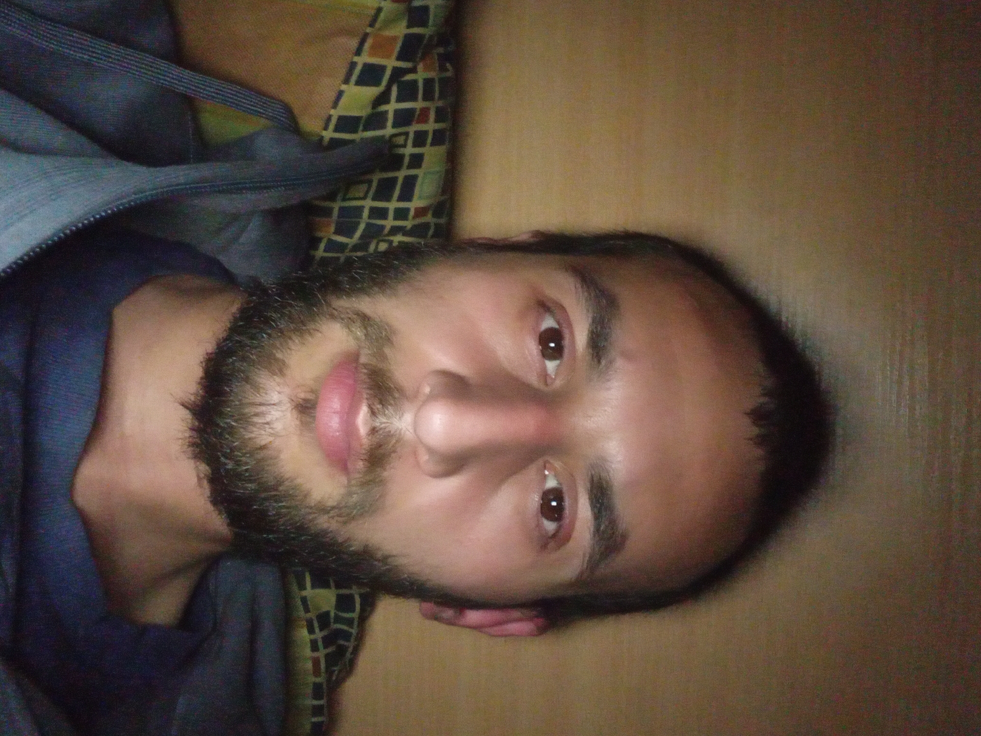 A man with dark hair and a beard is lying on his back, looking directly at the camera. He is wearing a blue shirt or jacket. He is resting on a surface with a checkered pillow to his left. A beige or light brown wall is behind him. There is no information to suggest that the picture was taken in Provadia, Bulgaria.