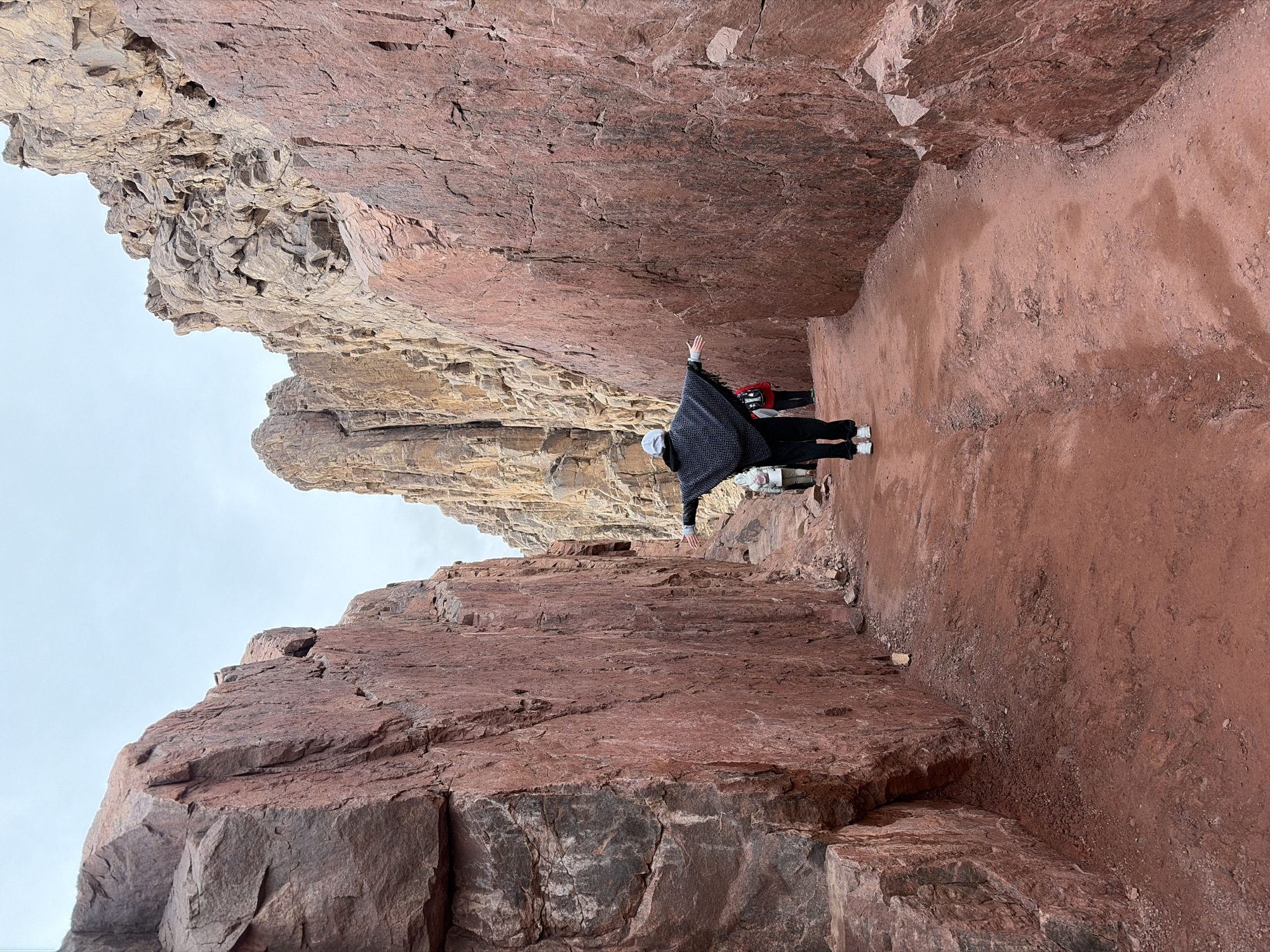 The image depicts a narrow path carved through towering, reddish-brown rock formations, presumably in a mountainous region. A person wearing a dark shawl and a white hat stands with their arms outstretched, appearing to embrace or interact with the rock walls. Other people are seen further down the path. The ground is a reddish-brown dirt or gravel. The sky is overcast. The location is likely Saint Catherine, Egypt.