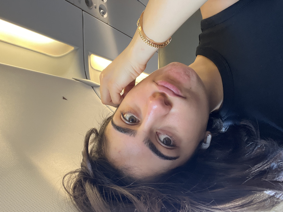 The image displays a close-up portrait of a female individual inside an airplane cabin, contextualized as occurring within the city of Matosinhos, Portugal. The subject, a young adult with dark brown, somewhat disheveled hair, is looking directly at the camera. Her facial expression is a pout, with lips slightly pursed and the lower lip protruding. She has dark brown eyes and prominent, dark eyebrows. Her skin appears clear and fair. A white wireless earbud is visible in her left ear. Her left hand is raised, with fingers lightly touching the side of her head. A gold-colored chain-link bracelet is worn on her left wrist. She is dressed in a black sleeveless top. The background consists of the interior of an aircraft cabin, featuring light-colored overhead panels, illuminated rectangular light fixtures emitting a warm yellow glow, and a series of passenger service unit elements (vents, call buttons) visible in the upper right.