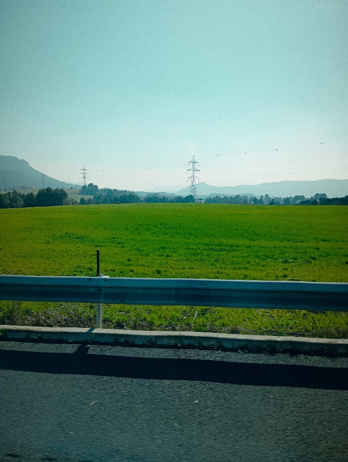 The image depicts a rural landscape within the vicinity of Òdena, Spain, observed from a roadside perspective. In the immediate foreground, a dark asphalt road surface is visible, bordered by a silver metal guardrail resting on a grey concrete curb. An elongated dark shadow is cast across the road. Beyond the guardrail, a wide, vibrant green field occupies the midground, with a slender dark stake or marker protruding vertically from the grass near the guardrail. The background features a line of dark green vegetation, followed by multiple layers of hazy, blue-grey hills. Two lattice-steel power transmission pylons are present: one partially obscured by a hill on the left, and another more distinctly visible on the right. The upper portion of the frame consists of a clear, light blue sky, populated by several small, dark, indistinct airborne specks. No individuals, explicit actions, or direct interactions are visible.