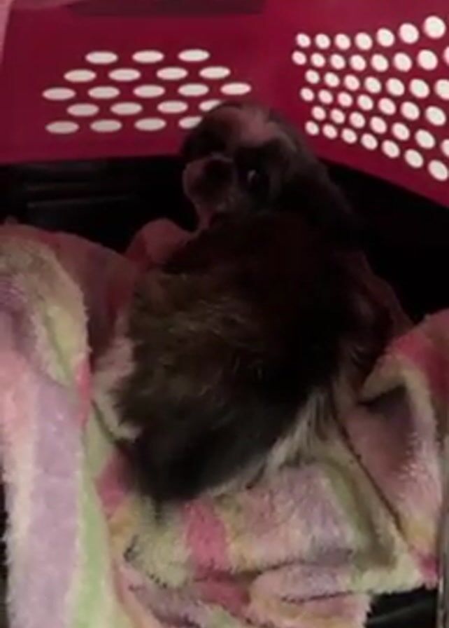 A small dog lies curled up on a colorful striped blanket inside a pink pet carrier. The dog is mostly dark-colored, with some white fur on its face. The carrier is made of plastic and has several circular openings for ventilation. A person is calling the dog's name, which sounds like "Jenya." The dog appears to be resting, looking slightly upwards. The lighting is slightly dim.