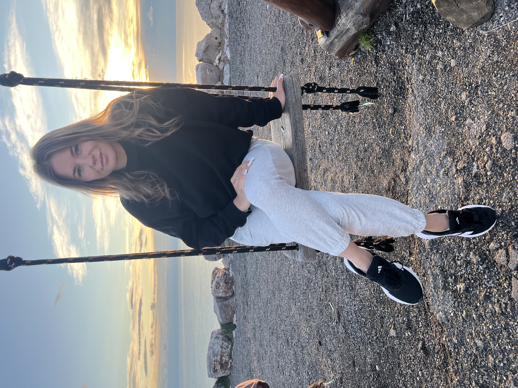 A young woman with long brown hair sits on a wooden swing, her legs crossed, and wearing a black sweatshirt, light gray sweatpants, and black and white athletic shoes. She is looking towards the camera, smiling. The swing appears to be located on a rocky, gravelly ground overlooking a scenic expanse of water and a horizon with a sunset or sunrise. The setting is likely Kovačko Polje, Montenegro, based on the landscape features and information provided. The lighting suggests either dawn or dusk.