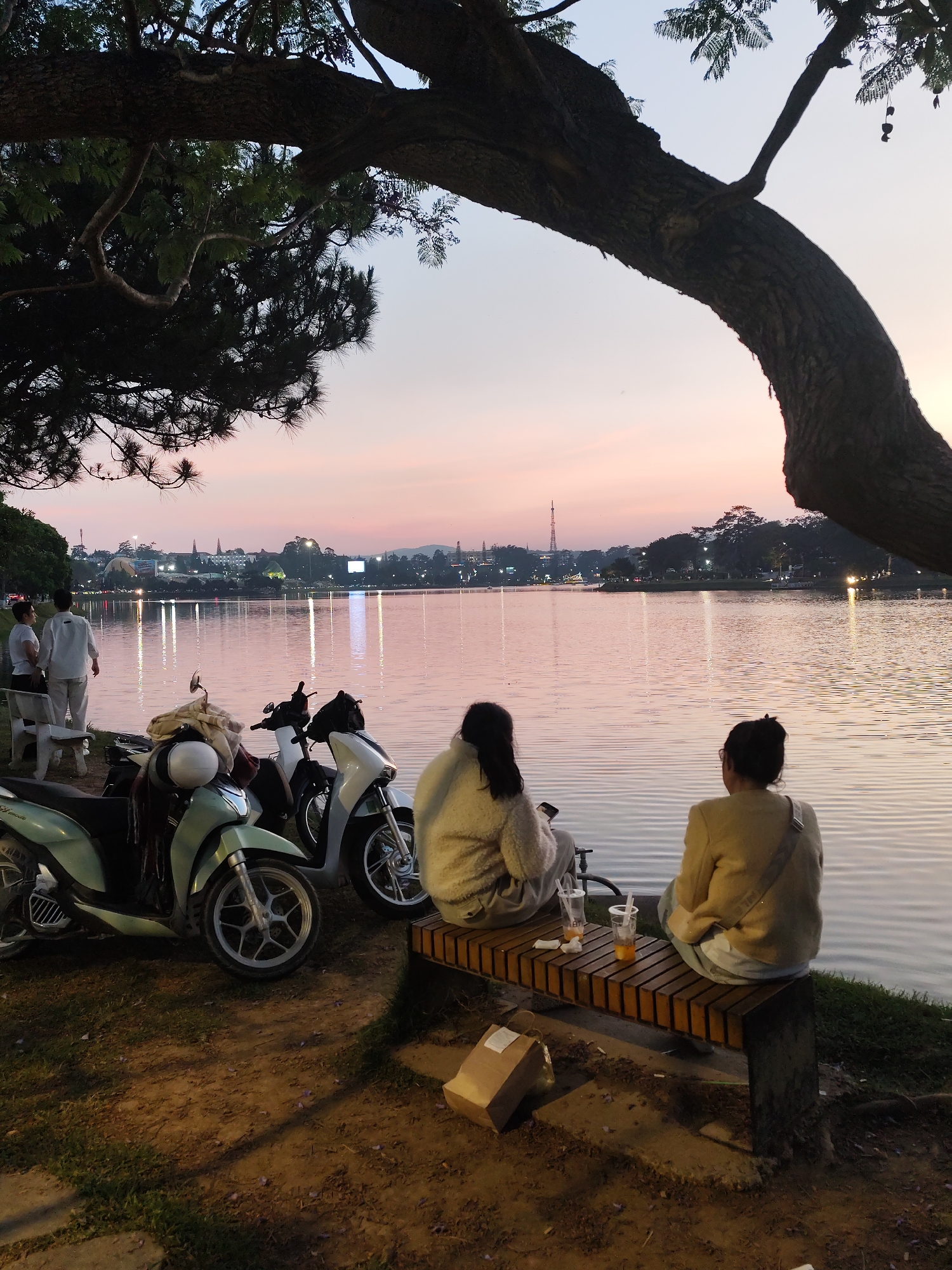 scene at Xuan Huong Lake in Da Lat, Vietnam, at dusk. Two women are sitting on a wooden bench facing the lake. There are two scooters parked nearby on the grass. Two other people stand on the left side of the image. Two plastic cups are on the bench. A tree branch frames the top of the image. The sky is pink and orange. The city skyline is visible across the lake with its lights reflecting in the water.