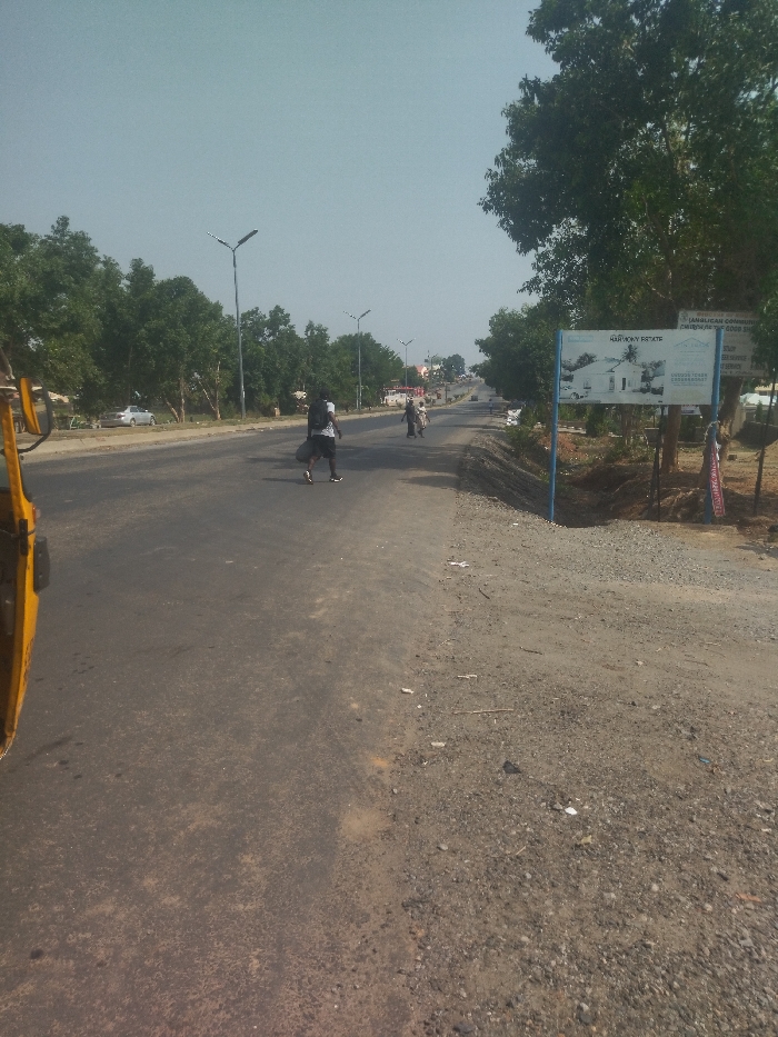 street scene in Abuja, Nigeria, with a paved road in the foreground and a dirt shoulder on the right