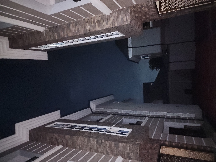 An upward perspective reveals a multi-story building at night. The lower portion showcases brickwork and linear architectural details, including what appear to be windows. Above, the darker area could represent a large open space like a yard or parking lot. To the right, the structure rises with a mix of gray and dark elements. Trees obscure some features. The overall tone is dark, with limited ambient lighting.