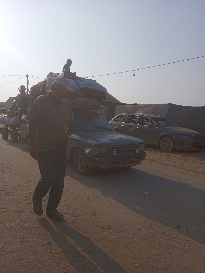 The image depicts an unpaved, dusty road in an unknown location within Khan Yunis, under clear, bright daylight with a low sun angle, evidenced by long shadows. In the foreground, an adult male with a beard, wearing a dark polo shirt, dark trousers, and a light-colored cap, walks generally rightwards across the road, his left hand at his waist. In the midground, a dark-colored pickup truck, visibly damaged with its front bumper missing, is present. It is towing a multi-axle trailer. Both the truck's bed and the trailer are overloaded with various items covered by tarpaulins and fabrics. At least three additional individuals are visible on the truck and trailer: one child is seated atop the cargo on the pickup truck, and two other persons are positioned further back on the trailer. To the right of these vehicles, a dark-colored station wagon is parked or stationary on a dirt shoulder. The background features various temporary structures constructed from corrugated metal sheets and tarpaulins. Utility wires are strung across the upper portion of the scene. A small piece of blue and white litter is visible on the dusty road surface.