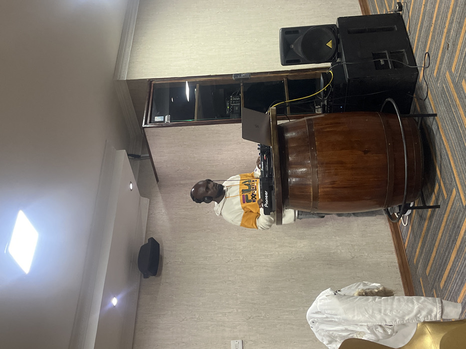 The image depicts an indoor event space within Nairobi, Kenya. A bald adult male, wearing a white, yellow, and orange "FILA EXPEDITION" hoodie and over-ear headphones, stands actively operating a DJ setup. His hands are positioned over a Pioneer brand DJ controller. A silver-colored laptop is open on a dark wooden, barrel-shaped table that serves as the DJ booth. To the right of the DJ setup, two black audio speakers are stacked: a top speaker with a visible Behringer logo and a subwoofer with a DM logo. Cables, including a yellow one, connect the electronic equipment. Behind the DJ, a tall wooden cabinet with glass doors houses additional electronic devices. The room's walls are covered with light-colored, textured wallpaper. The ceiling features a dropped section with recessed spotlights and a large, square LED panel light. A dark, wall-mounted speaker or fixture is visible on the left wall. The floor is carpeted with a geometric pattern comprising shades of grey, orange, and dark stripes. A golden chair with a white jacket draped over it is partially visible on the far left of the frame. The man is the sole individual clearly engaged in activity within the observable scene.