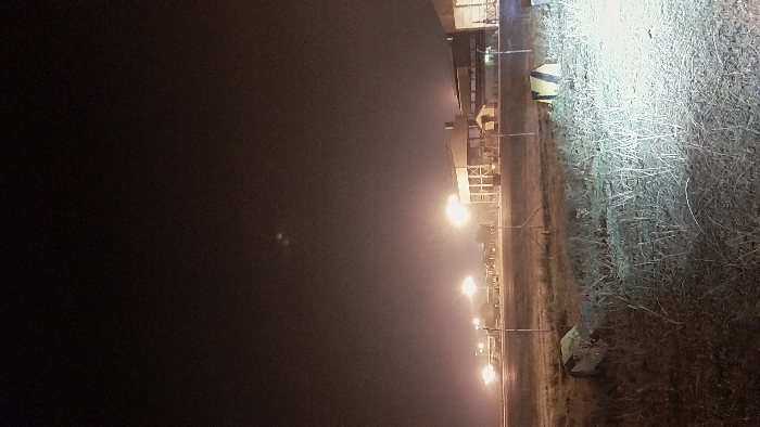 The image depicts a nighttime scene in Peurupok, Indonesia. The foreground consists of a sparsely vegetated, dry grassy field. In the lower-left, a light-colored, irregularly shaped block object rests on the ground. In the mid-right, a yellow and black striped barrier or block is present. A bright, focused beam of artificial light illuminates the lower-right quadrant of the foreground. Separating the foreground from the background is a fence line with vertical posts. Beyond this fence, multiple industrial or warehouse-style buildings are visible under the illumination of numerous artificial streetlights or floodlights. These buildings exhibit architectural details such as exposed structural supports and sloped roofs. The sky is dark, indicating night, with some circular light artifacts visible in the upper-mid section. No individuals, overt actions, or interactions are visible within the frame.
