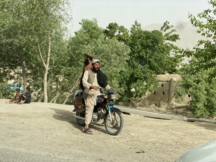 man in a light brown robe and a dark brown vest sitting on a motorcycle. The man is wearing a black headscarf and has a long beard. He is looking to the right side of the image. Behind him, a second man wearing a tan headscarf and a long-sleeved, tan shirt can be seen. The motorcycle is parked on a dirt road in front of a small, adobe building. The building has a flat roof and several windows. The man on the motorcycle is in the foreground of the image. Two boys are sitting on the ground to the left, in the background. The scene is located in the city of Sard-E 'olya, Afghanistan, at coordinates 31.707, 65.705. The area is dusty, suggesting a dry climate. The image was likely taken during the daytime, as the shadows suggest a sun source. The environment is a rural area, characterized by the presence of trees, the dirt road, and the mud-brick building.