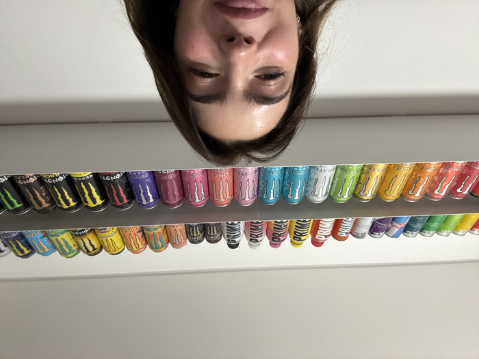A woman is upside down, with her face appearing at the top of the frame. Below her are two rows of energy drinks on a shelf. The top row features primarily Monster energy drinks in various colors. The bottom row includes a mix of brands, with Prime visible. The background appears to be a white wall.