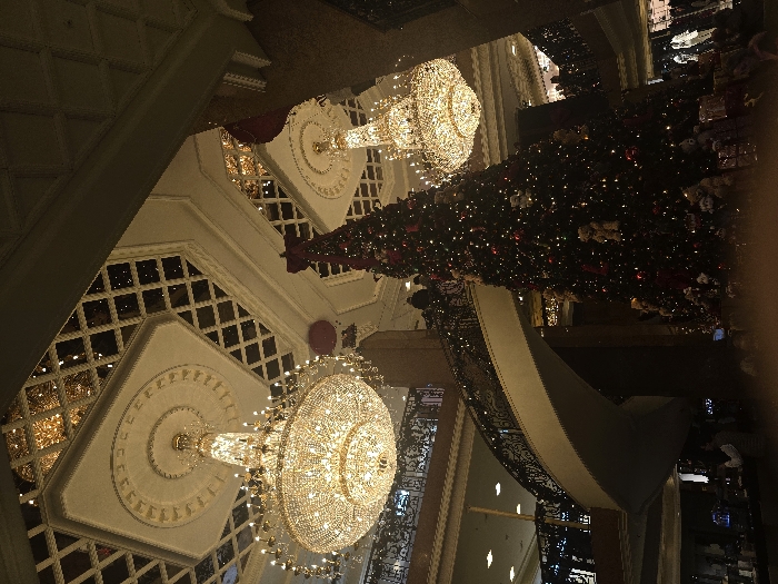 This image captures the opulent interior of a multi-level establishment in Monaco, Monaco, decorated for the holiday season