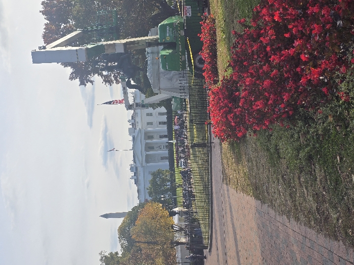 An outdoor daytime image depicts Lafayette Square in Washington D.C., United States, facing southeast towards the White House. In the foreground, a reddish-brown brick pathway curves to the left, bordered by patches of dry grass and rows of vibrant red flowers on the right. A black wrought-iron fence separates this immediate area from the main square. Beyond the fence, numerous individuals are gathered on the lawn. To the right, an industrial green boom lift, bearing the label "MODERN," is positioned next to the equestrian statue of Andrew Jackson, which stands on a white stone pedestal. The lift's arm extends upward over the statue's base and a portion of the horse. Yellow caution tape surrounds the base of the lift, indicating a work zone. In the mid-background, the White House is prominent, characterized by its neoclassical columns and portico. Two flags are visible flying above the White House. To the far left in the distant background, the Washington Monument obelisk stands tall. The environment features green lawns and trees displaying both green and autumnal foliage, all illuminated under a partly cloudy sky with bright sunlight.