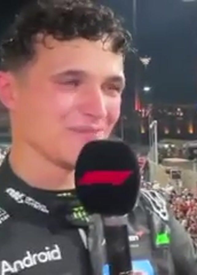 A man is holding a microphone and smiling. He has dark, curly hair and is wearing a black racing suit with green accents. The suit has logos for "Android", "Hilton", and "McLaren". He appears to be on a racetrack, possibly at night, with a large crowd of people behind him. There are tents, signs, and lights in the background. The microphone has the Formula 1 logo on it. The man seems to be giving an interview or making a speech.