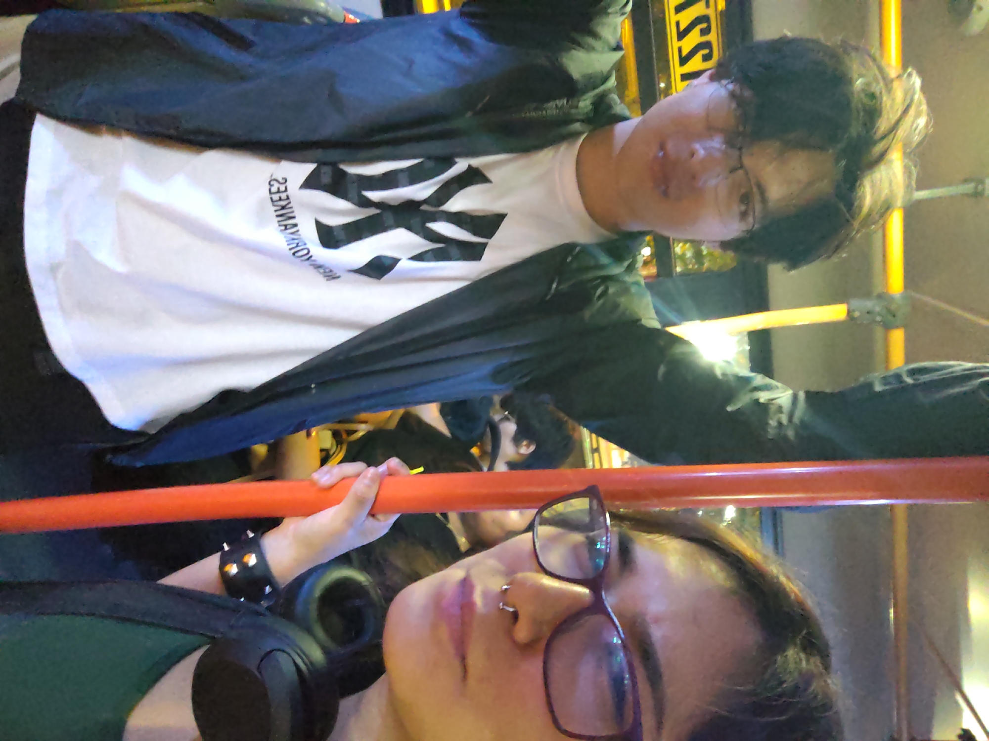 Two people are on a bus, likely in Surquillo, Peru. One person, wearing glasses and a nose ring, is holding onto a red metal pole. They are wearing a green shirt, black jacket, and headphones. A second person behind them is wearing a white shirt with a logo and a black jacket. The bus interior includes yellow signage and metal bars. Other passengers are visible in the background.